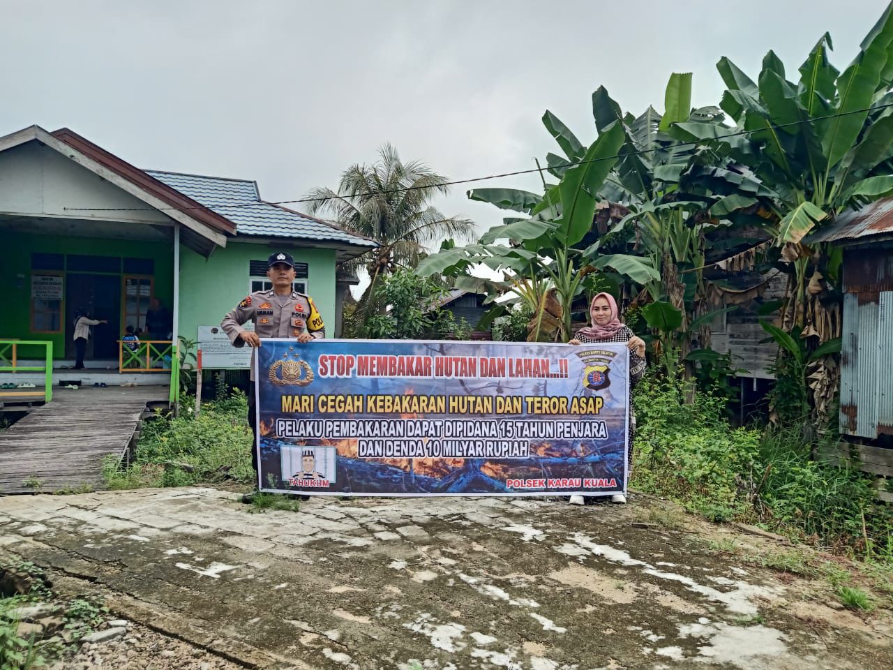 Polres Barsel – Personel Polsek Karau Kuala, Polres Barito Selatan (Barsel), Polda Kalteng, saat mensosialisasikan kepada masyarakat untuk mencegah Kebakaran Hutan dan Lahan (Karhutla) di Kel. Bangkuang, Buntok, Prov. Kalteng, Kamis (20/6/2024) siang.