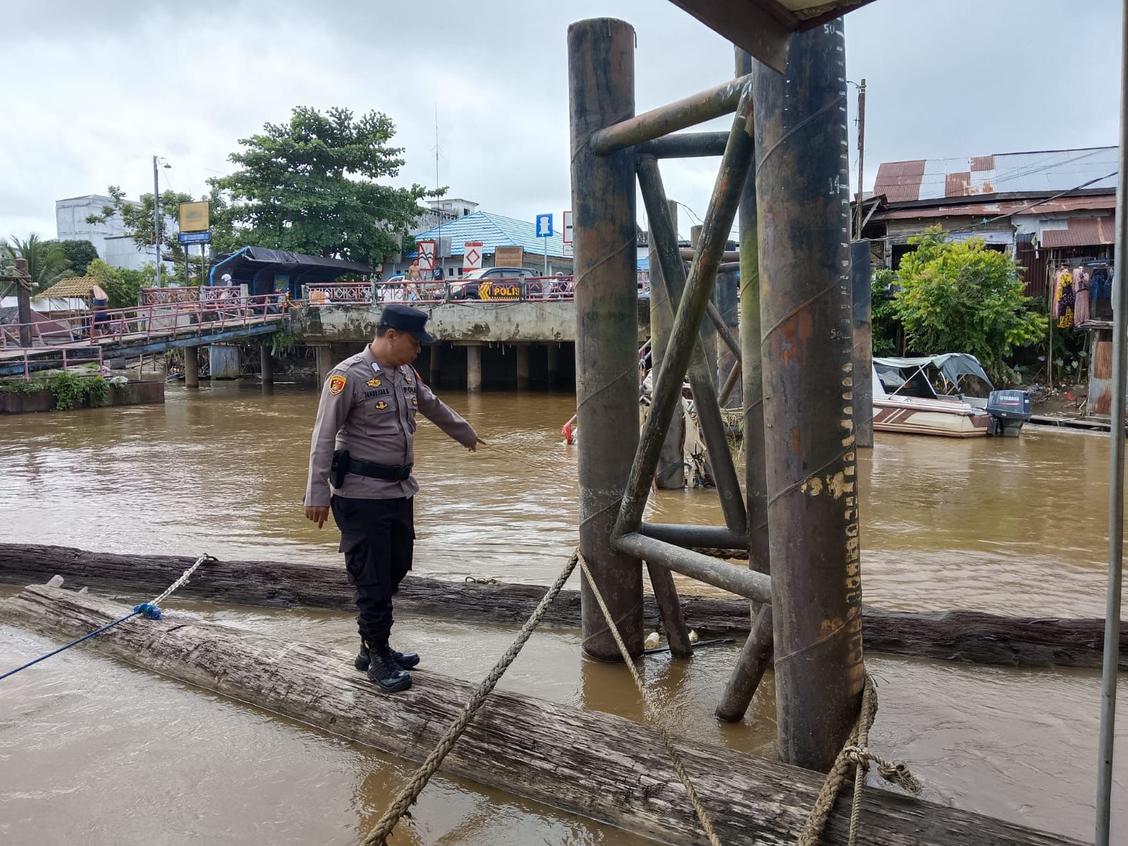 Polres Barsel – Mengantisipasi kenaikan air kiriman dari hulu Sungai Barito, personel Polsek Dusun Selatan (Dusel), Polres Baritro Selatan (Barsel), Polda Kalteng, melaksanakan patroli mengecek debit air di bantaran Sungai Barito, Kota Buntok, Sabtu (22/6/2024) siang.