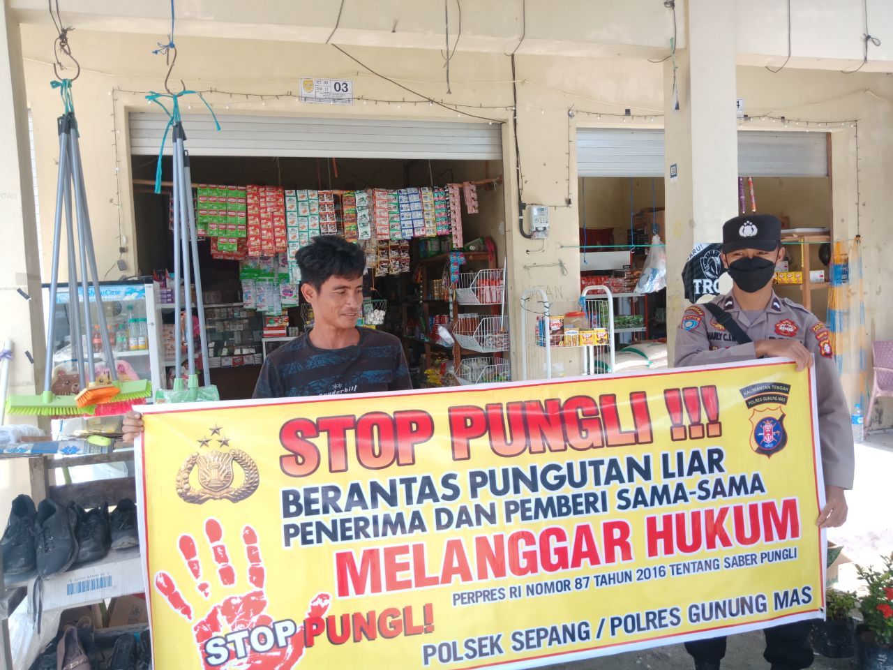 Polres Gunung Mas – Personel Polsek Sepang, Polda Kalteng, Gunung Mas, Kalimantan Tengah, mengedukasi kepada masyarakat setempat tentang bahaya pungutan liar. Langkah ini dilakukan sebagai upaya keras untuk memerangi praktik ilegal ini dan memberikan informasi kepada masyarakat mengenai hak-hak mereka serta konsekuensi hukum yang terkait dengan pungutan liar. Sabtu (29/6/24) sekira pukul 10.00 WIB.
