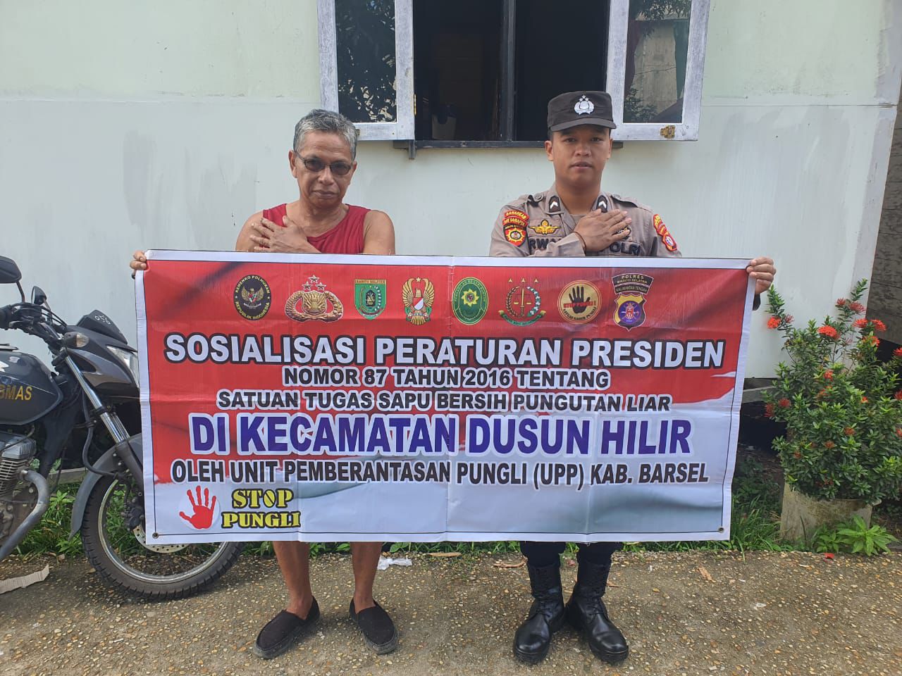 Polres Barsel – Personel Polsek Dusun Hilir (Dushil), Polres Barsel, Polda Kalteng, mensosialisasikan Peraturan Presiden nomor 87 tahun 2016 tentang Satuan Tugas Sapu Bersih Pungutan Liar atau Satgas Saber Pungli kepada masyarakat Kelurahan Mengkatip, Kec. Dushil, Kab. Barsel, Prov. Kalteng, Sabtu (10/8/2024) pagi.