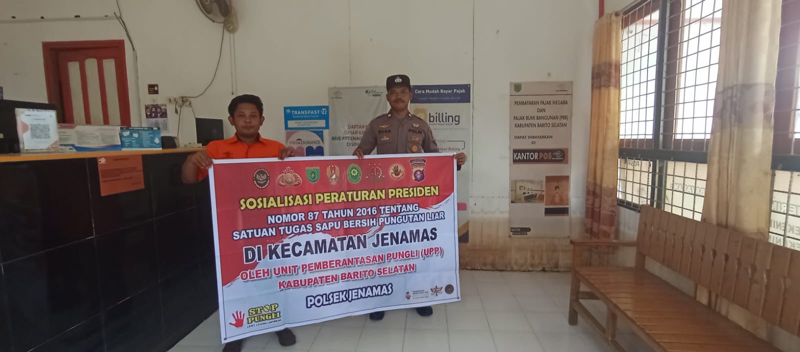 Kegiatan Sosialisasi peraturan Presiden nomor 87 tahun 2016 tentang satuan tugas sapu bersih pungutan liar (Satgas Saber Pungli) terus dilaksanakan oleh Satgas Saber Pungli Polsek Jenamas dengan terus menyambangi masyarakat maupun perkantoran yang memiliki jasa pelayanan masyarakat untuk memberikan sosialisasi dan edukasi.