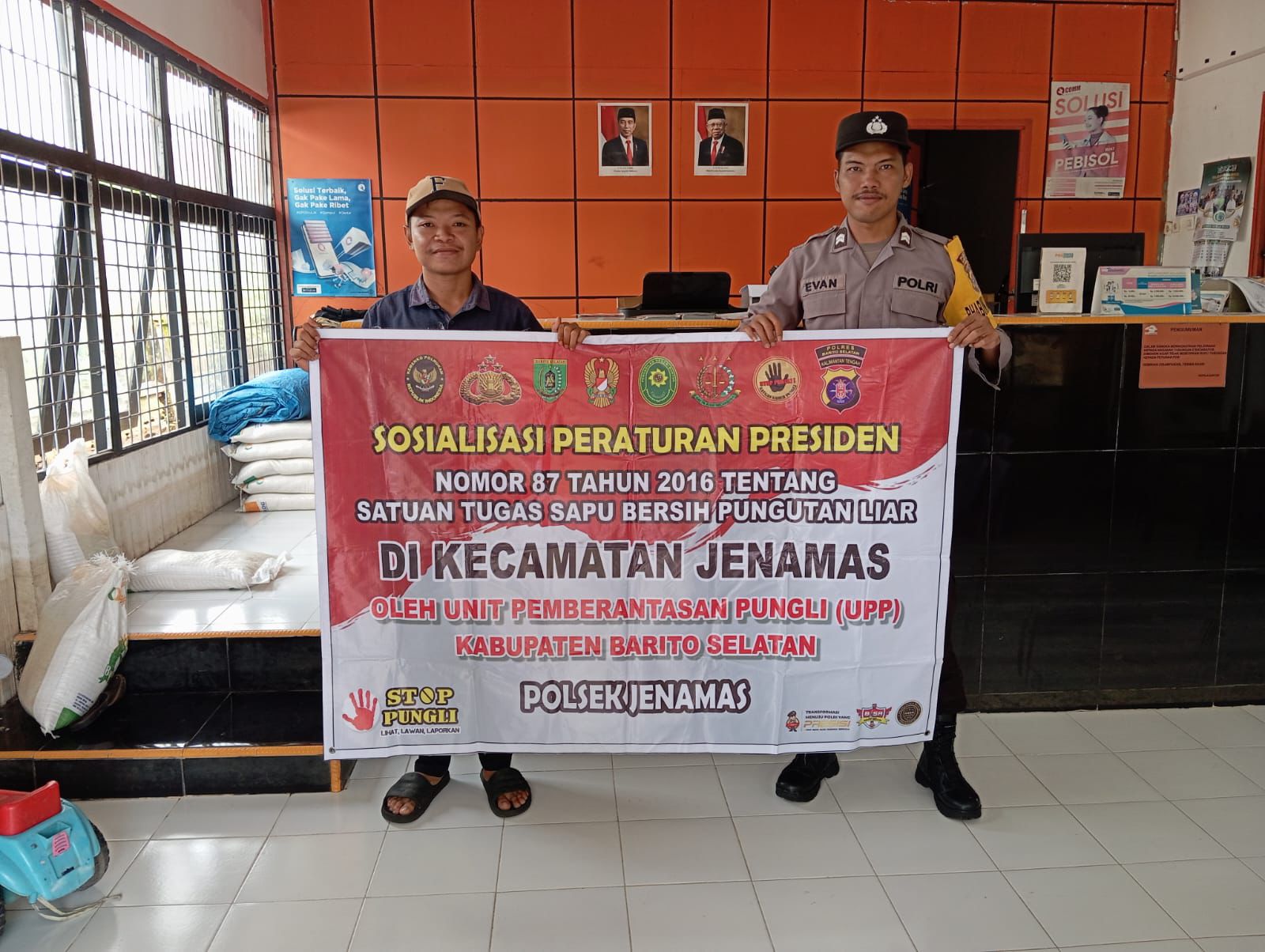 Kegiatan Sosialisasi peraturan Presiden nomor 87 tahun 2016 tentang satuan tugas sapu bersih pungutan liar (Satgas Saber Pungli) terus dilaksanakan oleh Satgas Saber Pungli Polsek Jenamas dengan terus menyambangi masyarakat maupun perkantoran yang memiliki jasa pelayanan masyarakat untuk memberikan sosialisasi dan edukasi.