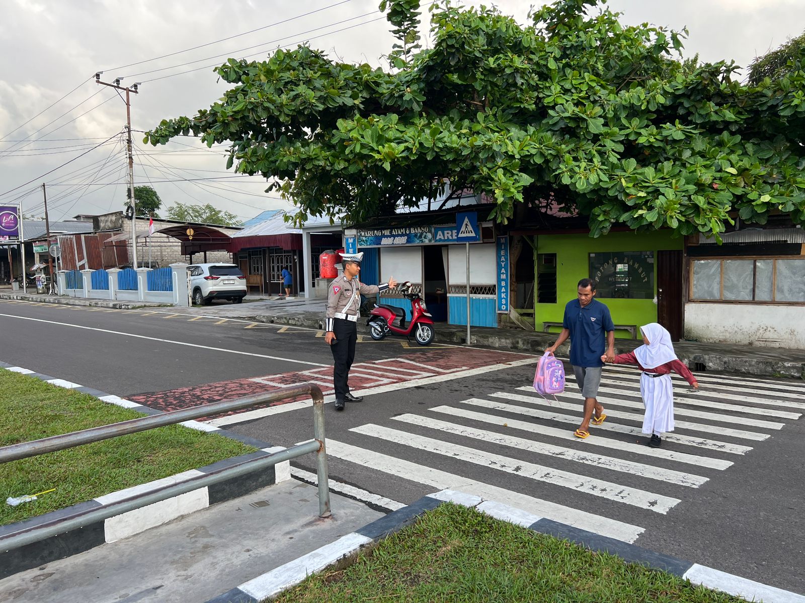 Personil Lalu Lintas Polres Sukamara Membantu Anak-anak Memulai Hari Sekolah dengan Aman