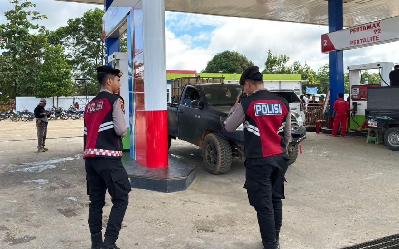 Seperti SPBU di Jl. Jenderal Sudirman Puruk Cahu, Kec. Murung, personil Patroli Presisi Satsamapta Polres Mura memantau antrian panjang untuk mendapatkan BBM bersubsidi, Rabu (1/10/2025) pukul 10.00 WIB.
