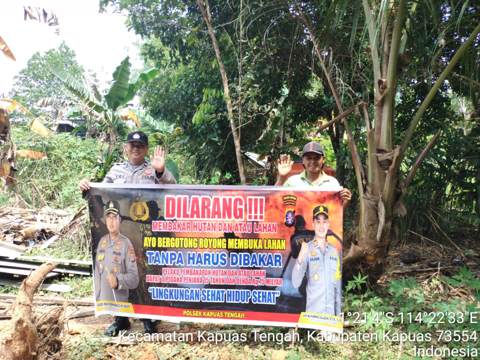Tribratanews.kalteng.polri.go.id – Polsek Kapuas tengah jajaran Polres Kapuas Polda Kalteng,Rabu(14/01/2026) , Polsek Kapuas Tengah jajaran Polres Kapuas Provinsi Kalimanatan Tengah telah melaksanakan Kegiatan Sosialisasi Larangan Karhutla dengan spanduk dan Maklumat Kapolda Kalteng tentang Sangsi dan Pidana buka lahan dengan cara membakar, sesuai dengan Pasal 187,188 KUHP, Pasal 78 UU No. 14 Th. 1999, Pasal 108 UU No. 39 Th. 2014, dan Pasal 25 Perda Kalteng No. 5 Th. 2003 Dengan ancaman Pidana 15 Tahun dan denda 15 Milyar.