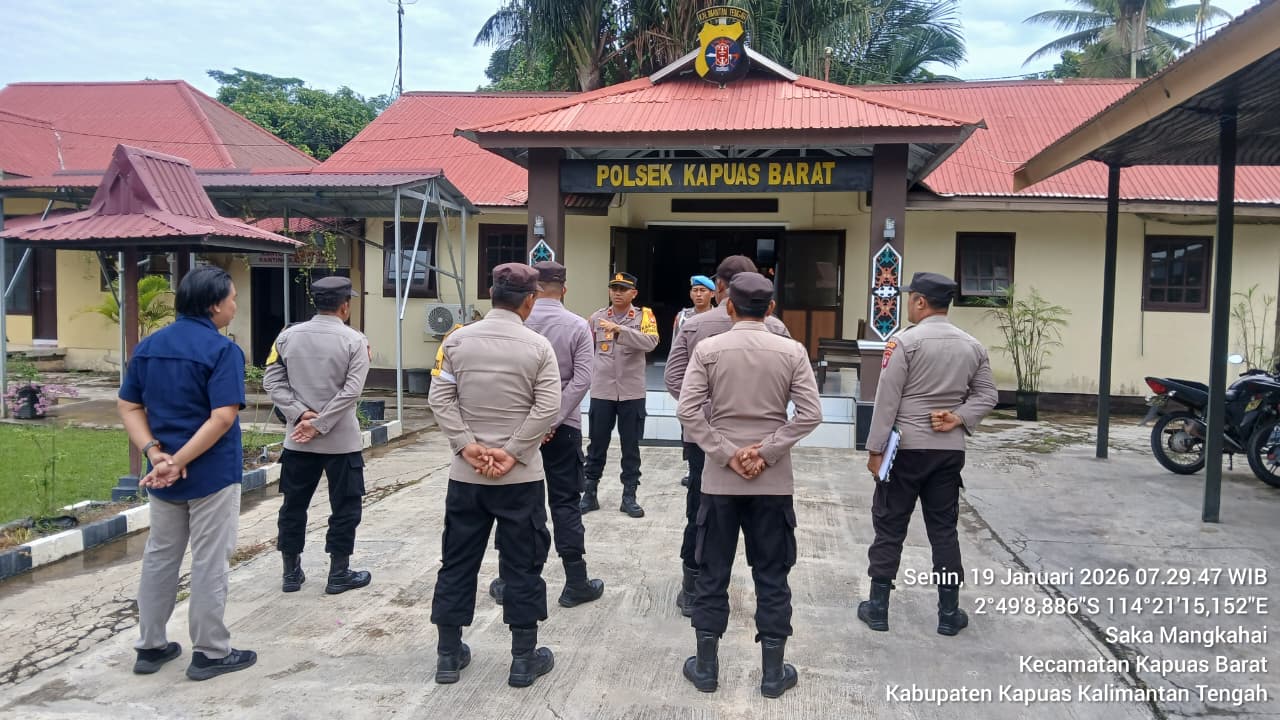 Personel Polsek Kapuas Barat melaksanakan apel pagi pada hari Senin, 19 Januari 2026, sekitar pukul 07.30 WIB. Kegiatan apel pagi tersebut dilaksanakan di Mako Polsek Kapuas Barat, Jalan Bhayangkara No. 55, Kelurahan Mandomai, Kecamatan Kapuas Barat, Kabupaten Kapuas, Provinsi Kalimantan Tengah.