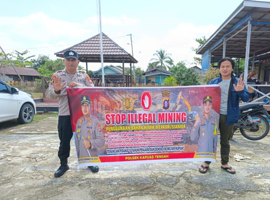 Polres Kapuas – Anggota Polsek Kapuas Tengah, Polres Kapuas, Polda Kalteng melaksanakan sosialisasi menggunakan sepanduk yang berbunyi Stop Penambangan Liar Dan Penggunaan Bahan Kimia Merkuri / Sianida, di Desa Pujon Kec. Kapuas Tengah Kab. Kapuas,Prov.Kalteng,Sabtu,24/01/2026.