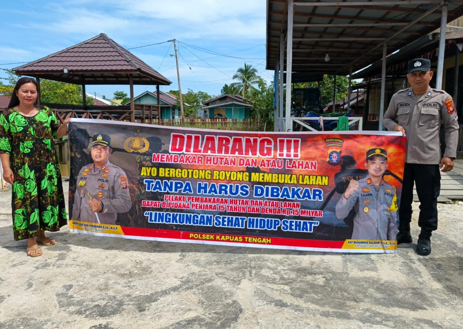 Tribratanews.kalteng.polri.go.id – Polsek Kapuas tengah jajaran Polres Kapuas Polda Kalteng,Sabtu(24/01/2026) , Polsek Kapuas Tengah jajaran Polres Kapuas Provinsi Kalimanatan Tengah telah melaksanakan Kegiatan Sosialisasi Larangan Karhutla dengan spanduk dan Maklumat Kapolda Kalteng tentang Sangsi dan Pidana buka lahan dengan cara membakar, sesuai dengan Pasal 187,188 KUHP, Pasal 78 UU No. 14 Th. 1999, Pasal 108 UU No. 39 Th. 2014, dan Pasal 25 Perda Kalteng No. 5 Th. 2003 Dengan ancaman Pidana 15 Tahun dan denda 15 Milyar.
