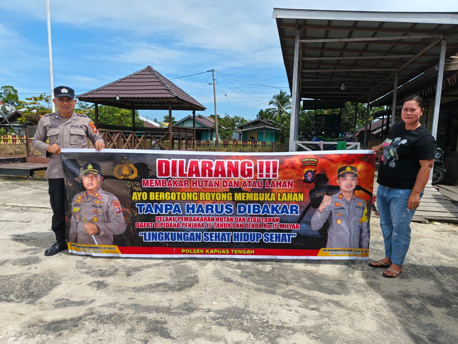 Tribratanews.kalteng.polri.go.id – Polsek Kapuas tengah jajaran Polres Kapuas Polda Kalteng,Selasa(27/01/2026) , Polsek Kapuas Tengah jajaran Polres Kapuas Provinsi Kalimanatan Tengah telah melaksanakan Kegiatan Sosialisasi Larangan Karhutla dengan spanduk dan Maklumat Kapolda Kalteng tentang Sangsi dan Pidana buka lahan dengan cara membakar, sesuai dengan Pasal 187,188 KUHP, Pasal 78 UU No. 14 Th. 1999, Pasal 108 UU No. 39 Th. 2014, dan Pasal 25 Perda Kalteng No. 5 Th. 2003 Dengan ancaman Pidana 15 Tahun dan denda 15 Milyar.