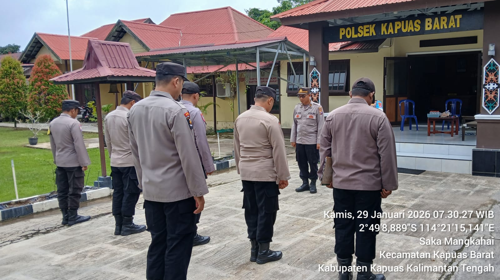 KAPUAS BARAT – Mengawali tugas pelayanan kepada masyarakat, personel Polsek Kapuas Barat melaksanakan apel pagi rutin di halaman Mapolsek pada Kamis (29/01/2026). Kegiatan apel kali ini dipimpin oleh Wakapolsek Kapuas Barat, Ipda Moh Sopii, atas instruksi dan pengawasan dari Kapolsek Kapuas Barat, Ipda Siswono Tri Soemantri, S.H., M.M.