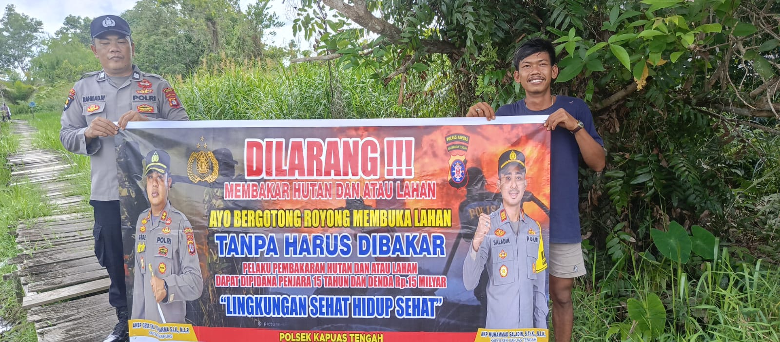 Tribratanews.kalteng.polri.go.id – Polsek Kapuas tengah jajaran Polres Kapuas Polda Kalteng,Selasa(24/02/2026) , Polsek Kapuas Tengah jajaran Polres Kapuas Provinsi Kalimanatan Tengah telah melaksanakan Kegiatan Sosialisasi Larangan Karhutla dengan spanduk dan Maklumat Kapolda Kalteng tentang Sangsi dan Pidana buka lahan dengan cara membakar, sesuai dengan Pasal 187,188 KUHP, Pasal 78 UU No. 14 Th. 1999, Pasal 108 UU No. 39 Th. 2014, dan Pasal 25 Perda Kalteng No. 5 Th. 2003 Dengan ancaman Pidana 15 Tahun dan denda 15 Milyar.