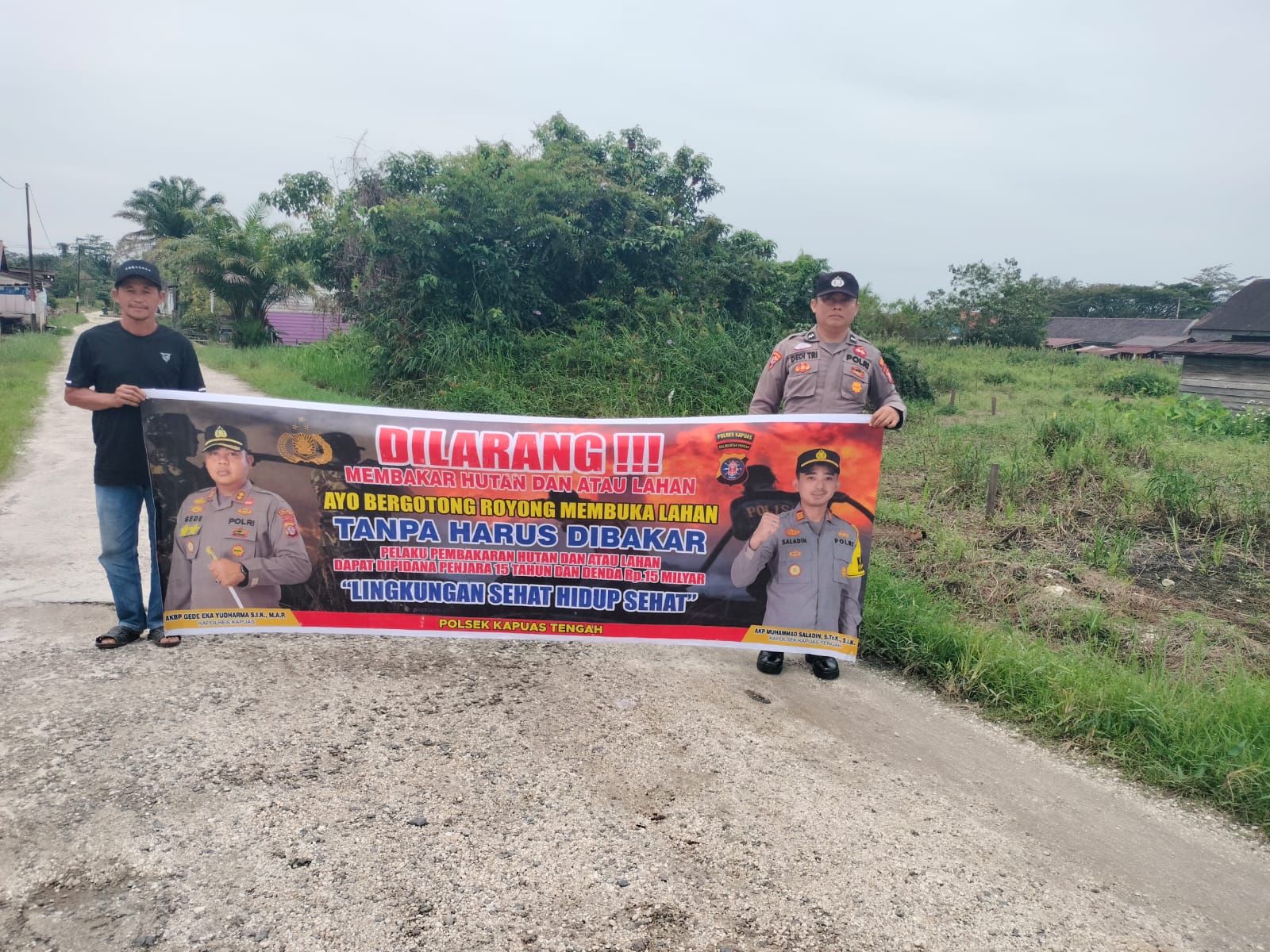 Tribratanews.kalteng.polri.go.id – Polsek Kapuas tengah jajaran Polres Kapuas Polda Kalteng,Sabtu(28/02/2026) , Polsek Kapuas Tengah jajaran Polres Kapuas Provinsi Kalimanatan Tengah telah melaksanakan Kegiatan Sosialisasi Larangan Karhutla dengan spanduk dan Maklumat Kapolda Kalteng tentang Sangsi dan Pidana buka lahan dengan cara membakar, sesuai dengan Pasal 187,188 KUHP, Pasal 78 UU No. 14 Th. 1999, Pasal 108 UU No. 39 Th. 2014, dan Pasal 25 Perda Kalteng No. 5 Th. 2003 Dengan ancaman Pidana 15 Tahun dan denda 15 Milyar.