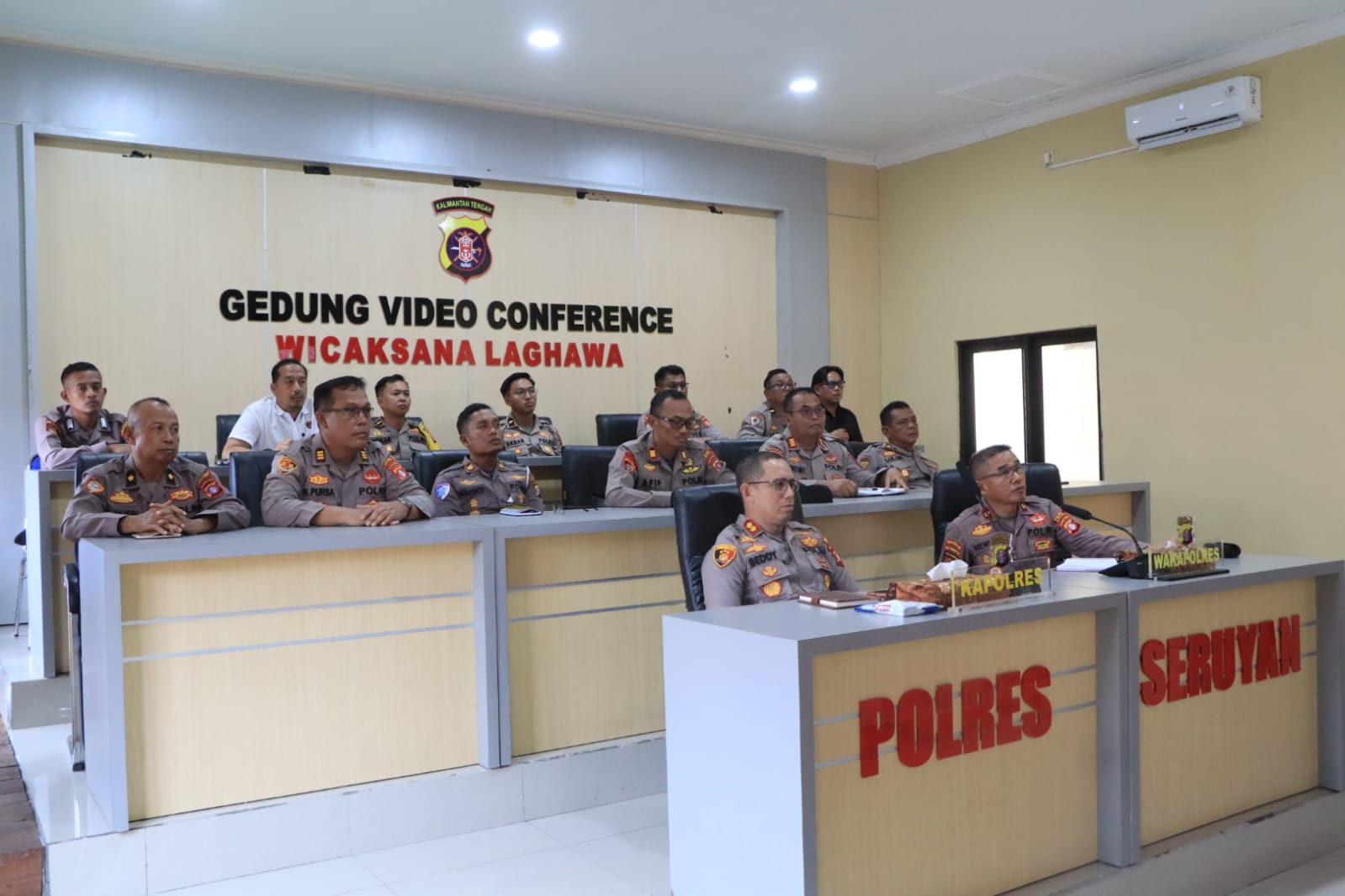 Kapolda Kalimantan Tengah Irjen Pol Iwan Kurniawan, S.I.K., M.Si., didampingi Wakapolda Kalteng Brigjen Pol Drs. Yosi Muhamartha, memberikan arahan kepada seluruh Pejabat Utama (PJU) Polda Kalteng dan jajaran Kapolres, termasuk Polres Seruyan, melalui video conference di Gedung Vicon Wicaksana Leghawa Polres Seruyan, Rabu (04/03/2026) pukul 09.50 WIB.