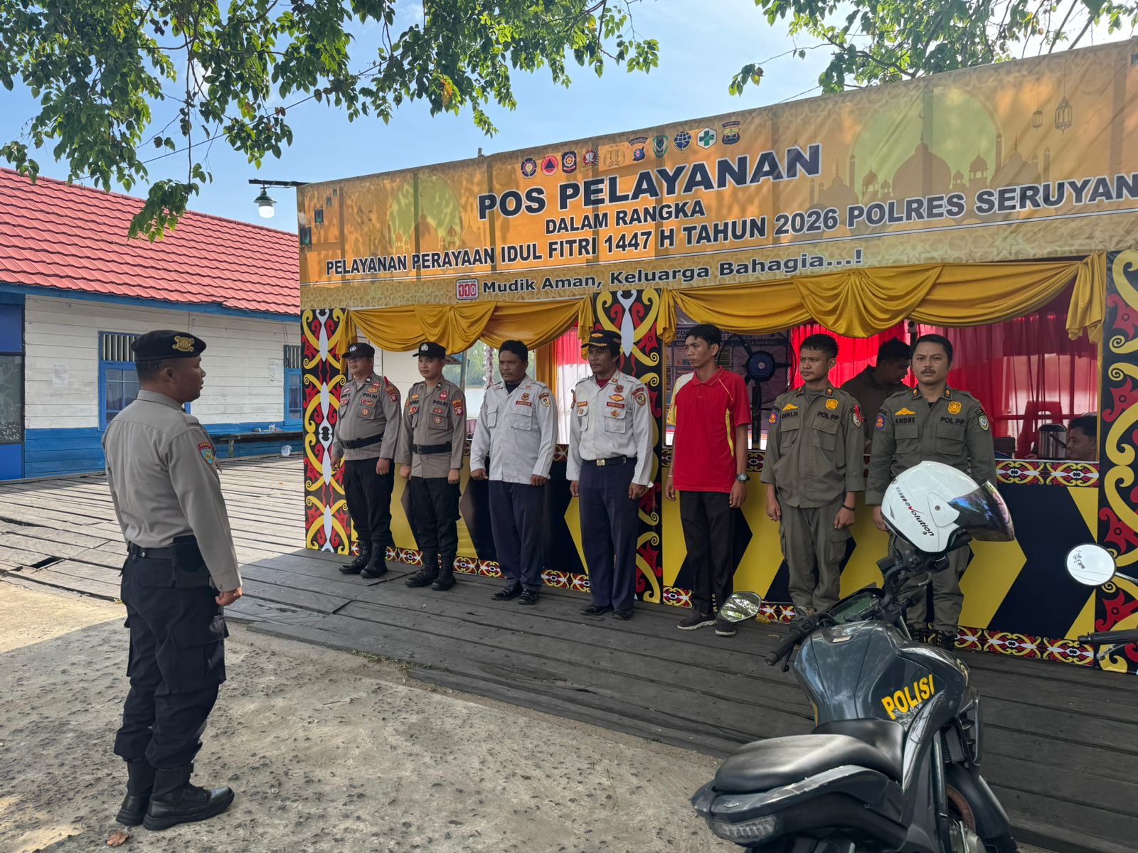 Polres Seruyan, 15 Maret 2026 – Personel gabungan yang bertugas di Pos Pelayanan Pelabuhan KP III melaksanakan apel piket jaga Regu III Operasi Ketupat Telabang 2026, Minggu (15/3/2026) pagi. Apel yang berlangsung mulai pukul 08.00 WIB ini dipimpin langsung oleh Padal Regu III Pos Pelayanan, IPDA Edi Purwanto.