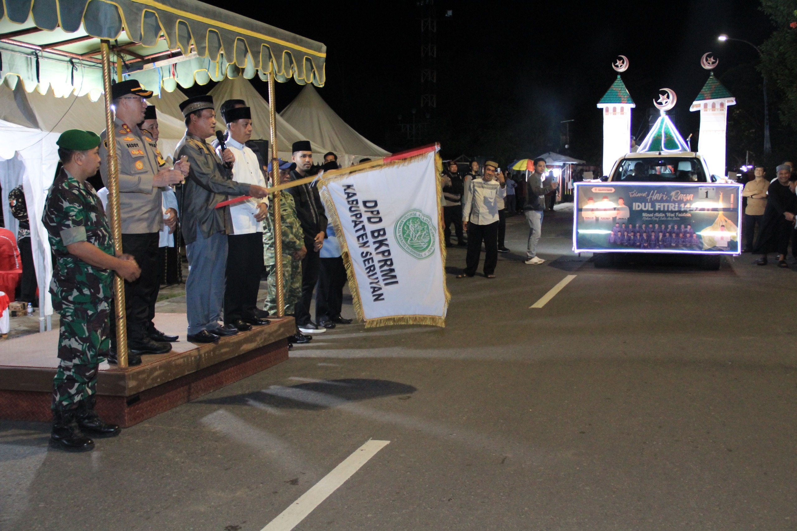 “Puji syukur marilah kita panjatkan ke hadirat Allah Subbahahu Wata’ala, karena pada malam yang penuh berkah ini, kita masih diberi limpahan karunia kesehatan dan keimanan, sehingga kita bisa berkumpul di sini dalam rangka pelepasan pawai takbir menyambut Hari Raya Idul Fitri 1447 H/2026 M,” ujar Ahmad Selanorwanda.