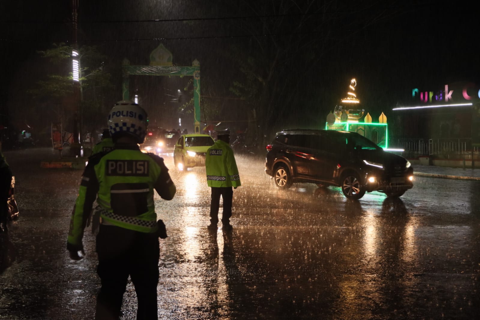 Puruk Cahu – Meskipun diguyur hujan deras, personel Polres Murung Raya (Mura) tetap semangat mengamankan acara pawai takbir Idul Fitri pada Jumat malam (20/03/2026).