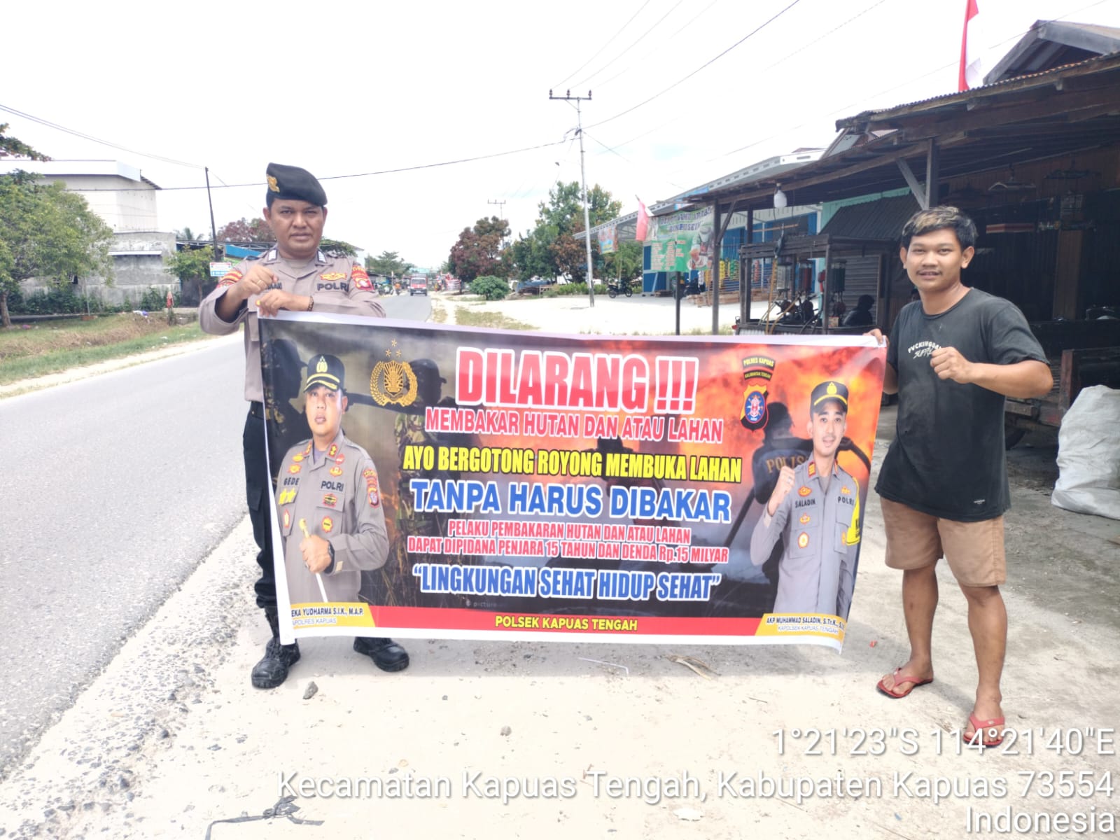 Tribratanews.kalteng.polri.go.id – Polsek Kapuas tengah jajaran Polres Kapuas Polda Kalteng,Senin,30/03/2026) , Polsek Kapuas Tengah jajaran Polres Kapuas Provinsi Kalimanatan Tengah telah melaksanakan Kegiatan Sosialisasi Larangan Karhutla dengan spanduk dan Maklumat Kapolda Kalteng tentang Sangsi dan Pidana buka lahan dengan cara membakar, sesuai dengan Pasal 187,188 KUHP, Pasal 78 UU No. 14 Th. 1999, Pasal 108 UU No. 39 Th. 2014, dan Pasal 25 Perda Kalteng No. 5 Th. 2003 Dengan ancaman Pidana 15 Tahun dan denda 15 Milyar.