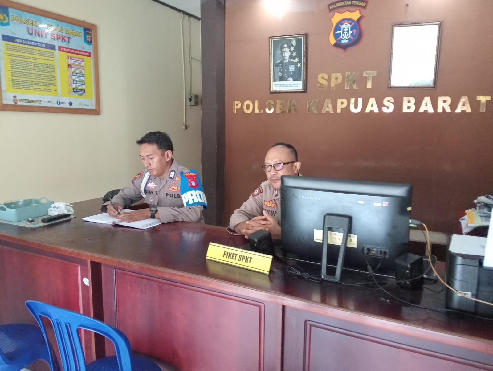 Personel Polsek Kapuas Barat terus meningkatkan kualitas pelayanan kepada masyarakat melalui Sentra Pelayanan Kepolisian Terpadu (SPKT) yang berada di wilayah Kecamatan Kapuas Barat. Pelayanan ini diberikan sebagai bentuk komitmen kepolisian dalam memberikan kemudahan bagi masyarakat yang membutuhkan bantuan maupun pengaduan terkait permasalahan hukum.Kamis (02/04/2026)