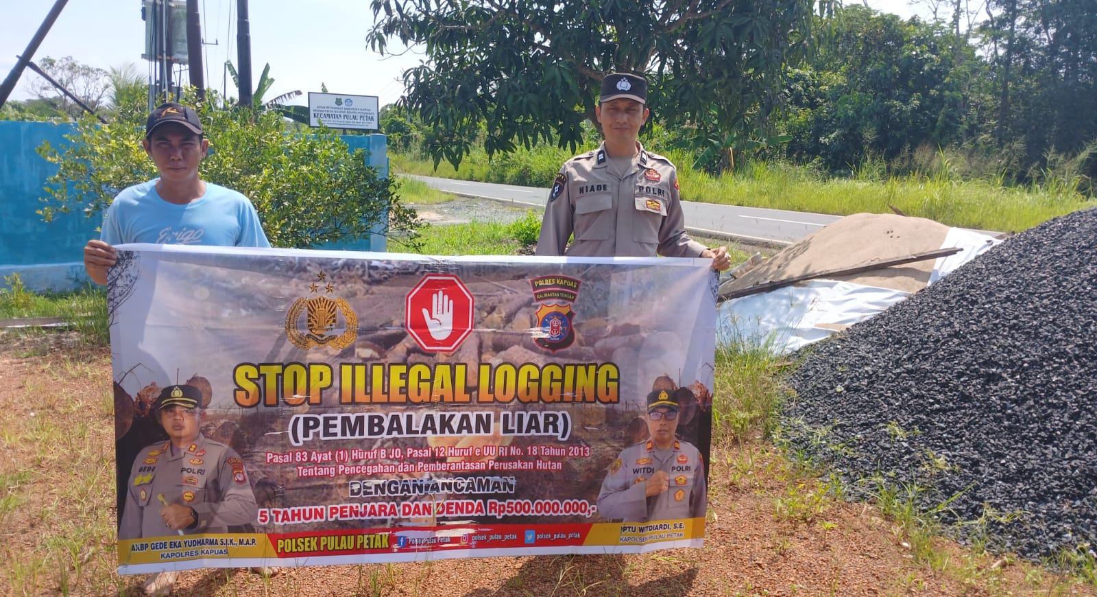 Kapolsek Pulau Petak Iptu Witdiardi, S.E.,mengatakan untuk kegiatan hari ini dilaksanakan himbauan kepada Masyarakat Dalam Rangka pencegahan terjadinya pembalakan liar beserta penyampaian pasal, sanksi kurungan dan denda yang menjerat pelaku ilegal loging dan dengan menggunakan spanduk stop stop ilegal loging.