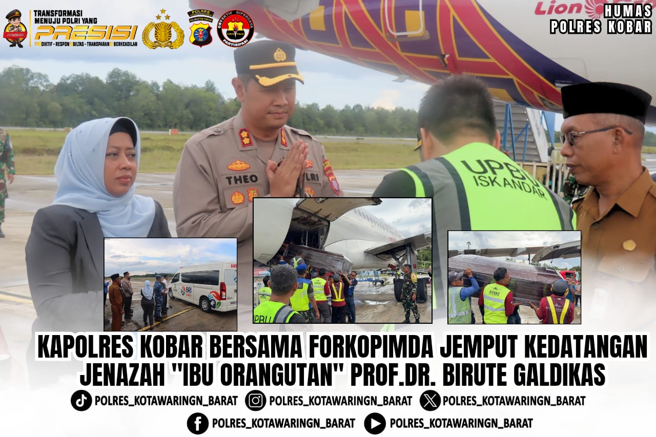 Polres Kobar – Kapolres Kotawaringin Barat AKBP Theodorus Priyo Santosa, S.I.K., bersama unsur Forum Koordinasi Pimpinan Daerah (Forkopimda) Kobar melakukan penjemputan jenazah Prof. Dr. Birute Mary Galdikas, ahli primatologi dunia yang dikenal sebagai “Ibu Orangutan”. Senin (13/04/2026) sore.
