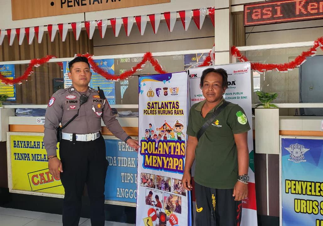 Melalui program humanis bertajuk Polantas Menyapa, petugas kepolisian aktif berinteraksi dengan masyarakat untuk memberikan edukasi dan sosialisasi standar pelayanan Samsat Mura secara langsung.