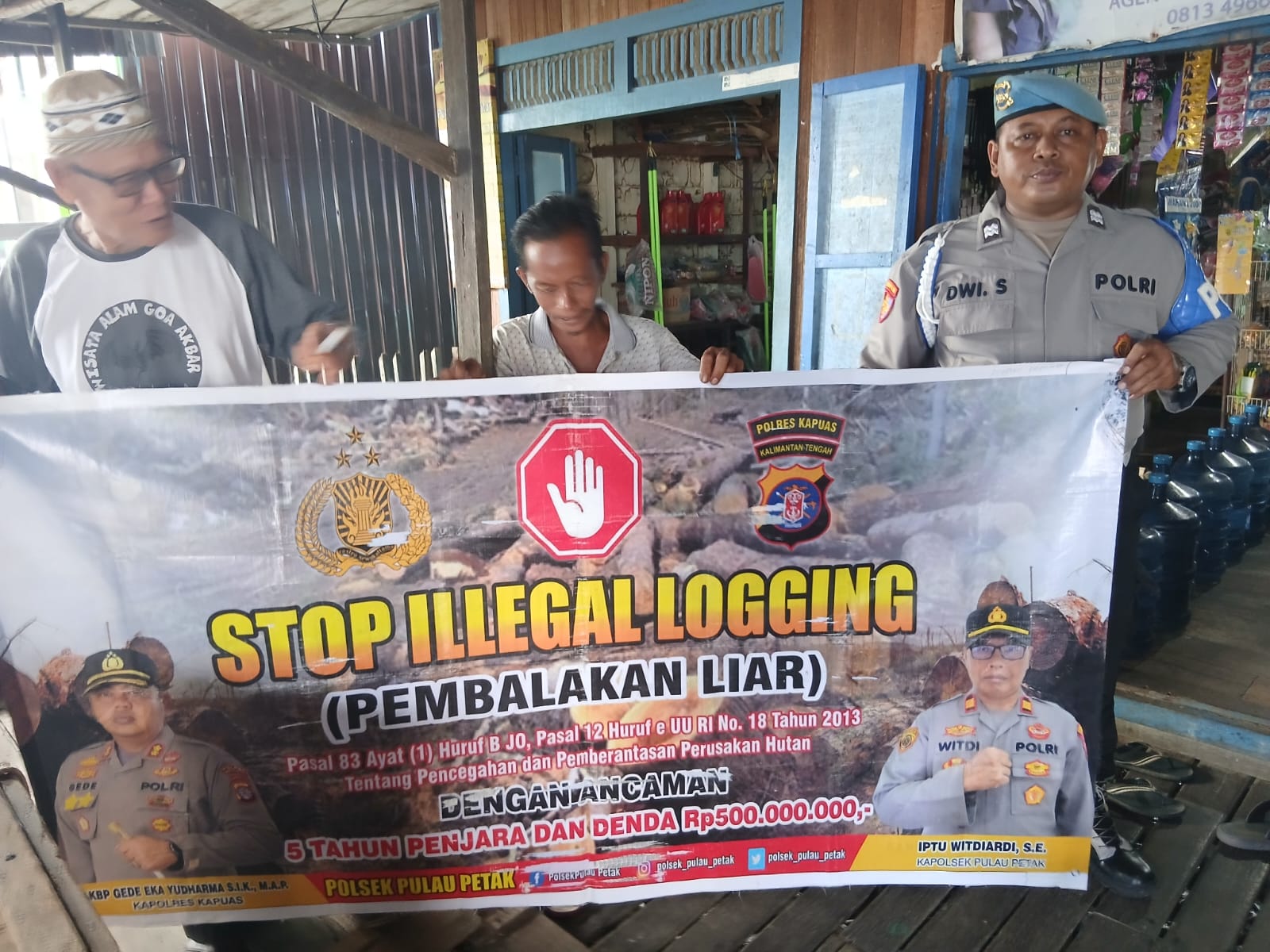 Kapolsek Pulau Petak Iptu Witdiardi, S.E.,mengatakan untuk kegiatan hari ini dilaksanakan himbauan kepada Masyarakat Dalam Rangka pencegahan terjadinya pembalakan liar beserta penyampaian pasal, sanksi kurungan dan denda yang menjerat pelaku ilegal loging dan dengan menggunakan spanduk stop stop ilegal loging.