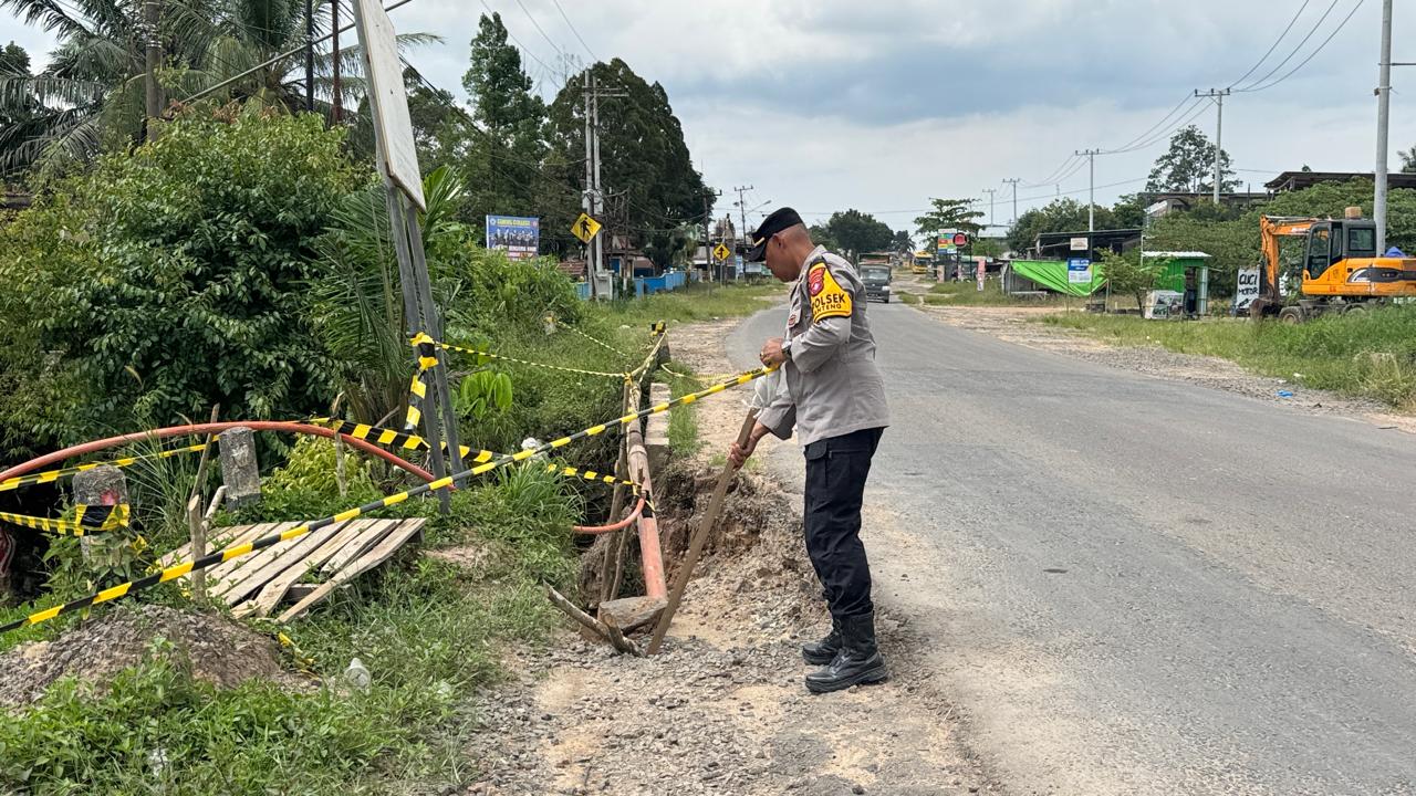 bersama Kanit Reskrim, Kanit Intel, dan Bhabinkamtibmas.Di lokasi, personel memasang police line di sejumlah titik rawan pada bahu jembatan yang amblas untuk mencegah terjadinya kecelakaan lalu lintas. Selain itu, petugas juga memberikan tanda peringatan di badan jalan sebagai penanda bahaya agar pengendara lebih waspada saat melintas.Kapolsek Pangkalan Banteng IPTU AGUNG SUGIARTO, S.H., M.H. mengatakan, hingga saat ini terdapat dua jembatan yang longsor dan berpotensi menimbulkan kerawanan laka lantas.