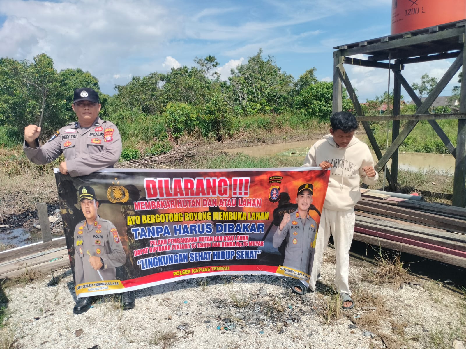 Tribratanews.kalteng.polri.go.id – Polsek Kapuas tengah jajaran Polres Kapuas Polda Kalteng,Kamis,23/04/2026) , Polsek Kapuas Tengah jajaran Polres Kapuas Provinsi Kalimanatan Tengah telah melaksanakan Kegiatan Sosialisasi Larangan Karhutla dengan spanduk dan Maklumat Kapolda Kalteng tentang Sangsi dan Pidana buka lahan dengan cara membakar, sesuai dengan Pasal 187,188 KUHP, Pasal 78 UU No. 14 Th. 1999, Pasal 108 UU No. 39 Th. 2014, dan Pasal 25 Perda Kalteng No. 5 Th. 2003 Dengan ancaman Pidana 15 Tahun dan denda 15 Milyar.