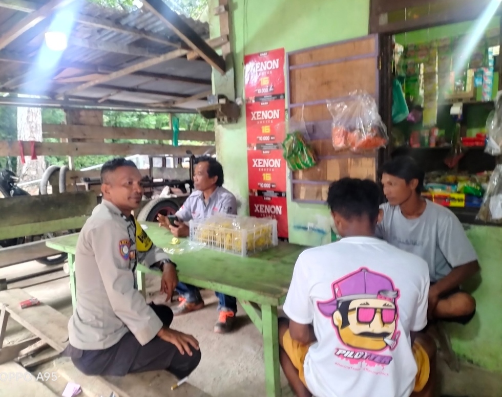 Tampak dalam foto, BRIPDA AHMAD SHEVA NUR IHSAN dengan seragam dinas lengkap dan ban lengan “BHABINKAMTIBMAS” duduk di bangku kayu bersama seorang warga. Bhabinkamtibmas menunjuk dan menjelaskan isi brosur layanan polisi bertuliskan “110” yang dipegang warga tersebut. Brosur memuat informasi “LAYANAN POLISI” dan panduan penggunaan call center untuk masyarakat yang butuh bantuan Polri.Kegiatan yang dimulai pukul 09.00 WIB ini menyasar warga masyarakat RT.002 Desa Sumber Mukti secara door to door.
