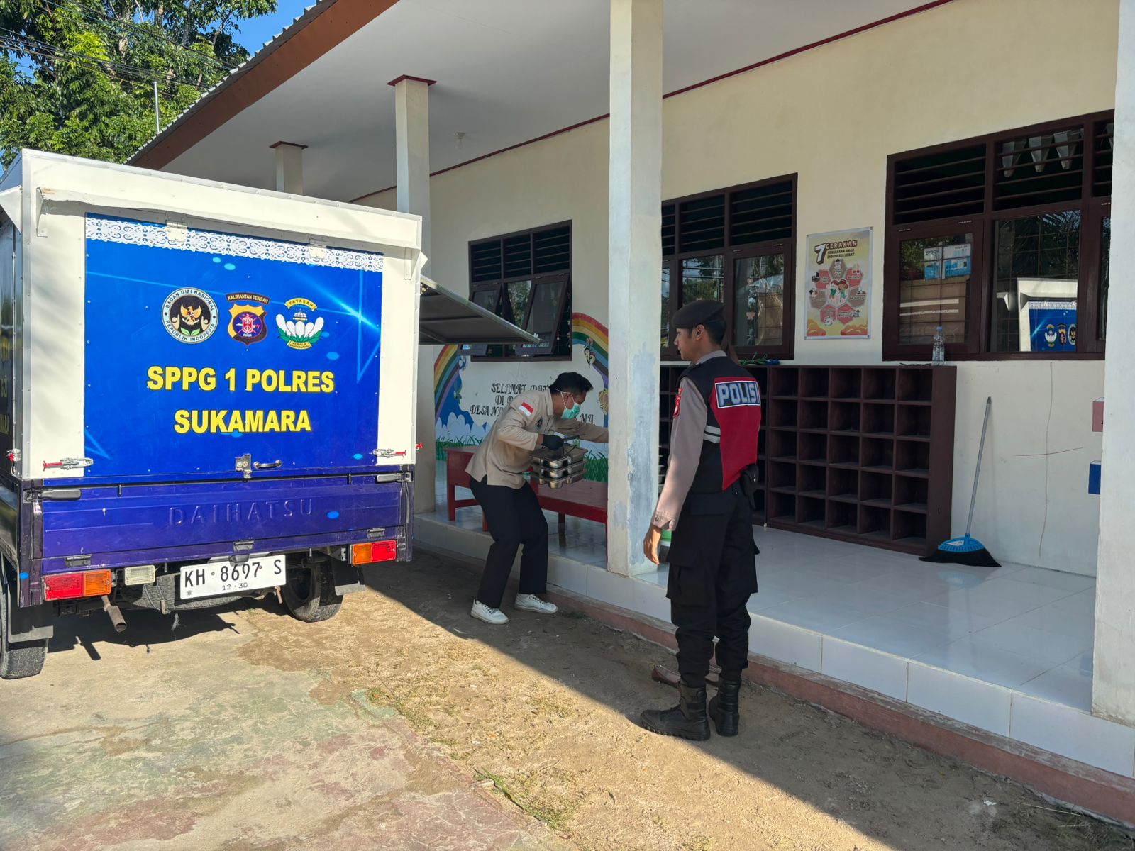 SUKAMARA – Sat Samapta Polres Sukamara melaksanakan kegiatan pengawalan pendistribusian Makanan Bergizi Gratis (MBG) ke sekolah-sekolah yang ada di wilayah Kota Sukamara sebagai bentuk dukungan terhadap program pemerintah dalam meningkatkan kualitas gizi dan kesehatan peserta didik di lingkungan sekolah. Kegiatan ini juga menjadi bagian dari upaya Polri dalam memberikan pelayanan terbaik kepada masyarakat, khususnya dalam mendukung program yang bersifat sosial dan kemanusiaan, Selasa (28/04/2026) pagi.