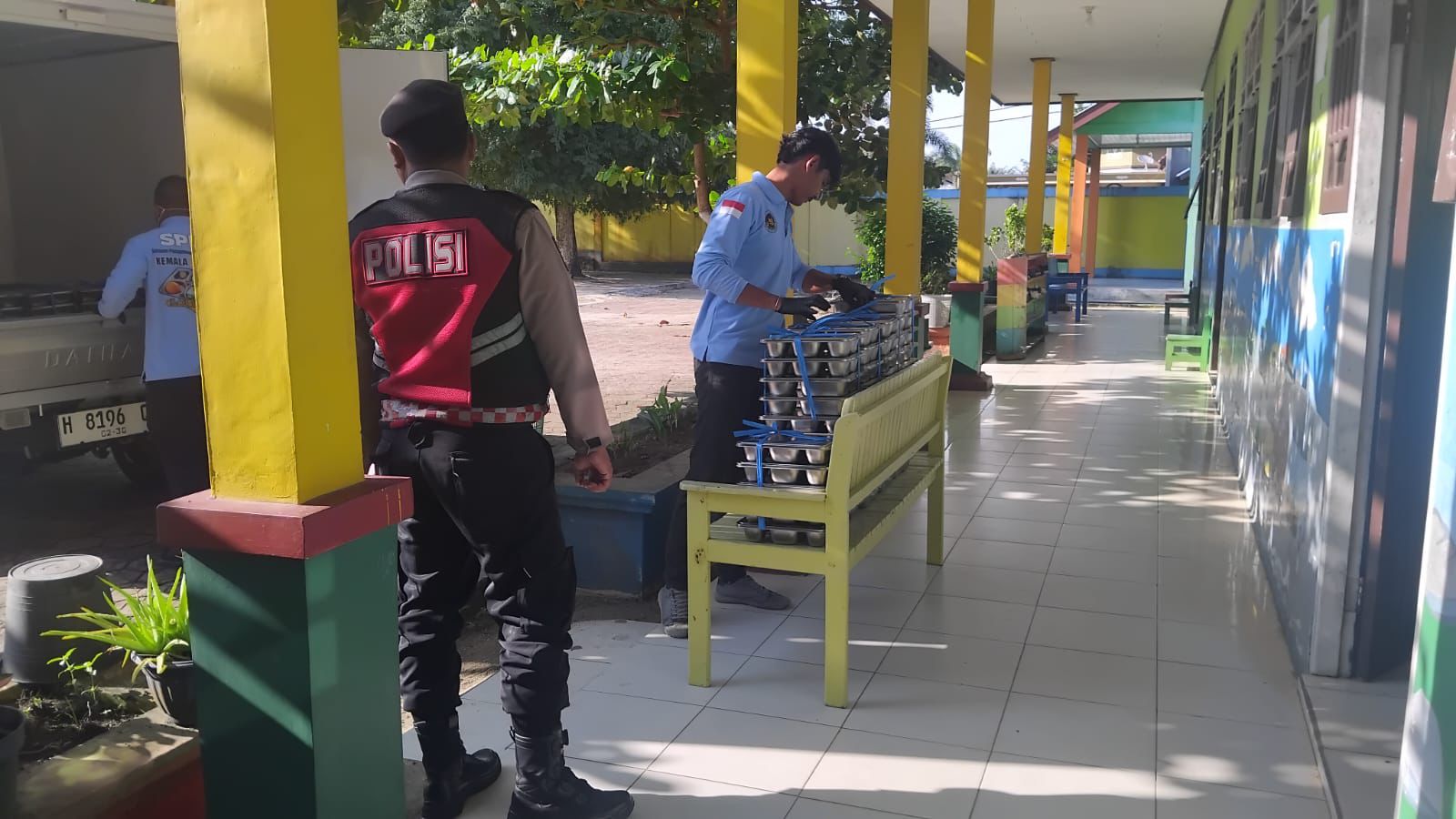 Petugas memeriksa jumlah paket makanan agar sesuai dengan jumlah siswa di sekolah. Sat Samapta juga membantu mengatur posisi distribusi agar tidak terjadi kerumunan dan setiap siswa dapat mengambil makanannya dengan tertib. Kehadiran personel di lapangan membuat proses ini berjalan dengan sangat efisien dan memastikan tidak ada satu pun siswa yang terlewatkan dalam mendapatkan makan siang.